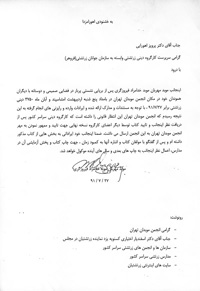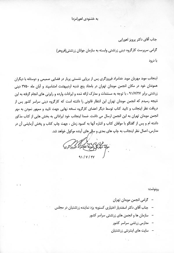 تصویر نامه جناب آقای موبد مهریان فیروزگری