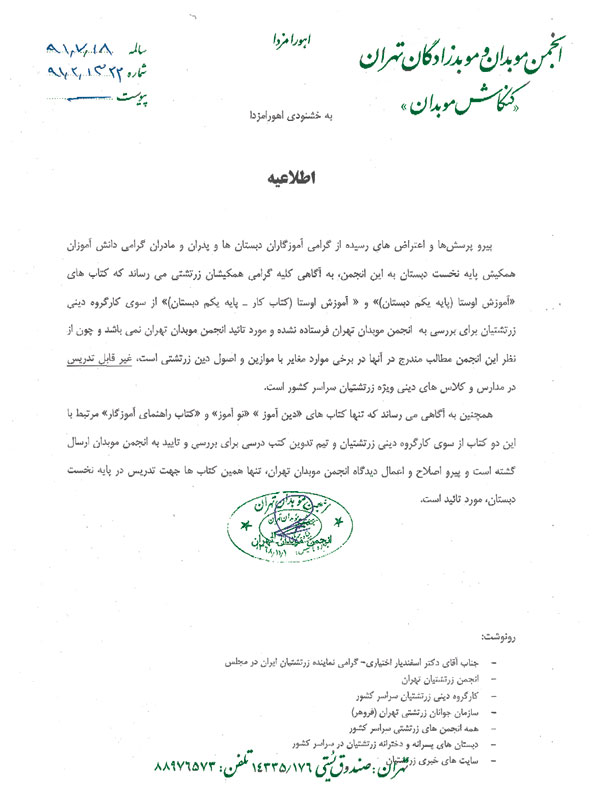 تصویر اطلاعیه انجمن موبدان و همچنین نامه جناب آقای موبد مهریان فیروزگری درباره کتاب آموزش اوستای سال نخست دبستان در ادامه آمده است و اطلاعیه آتی انجمن موبدان تهران درباره این موضوع در آینده نزدیک به آگاهی همکیشان خواهد رسید.
